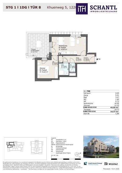 Wohnfläche: ca. 42,86m² + Terrasse: ca. 17,01m² + Kellerabteil: ca. 2,21m²