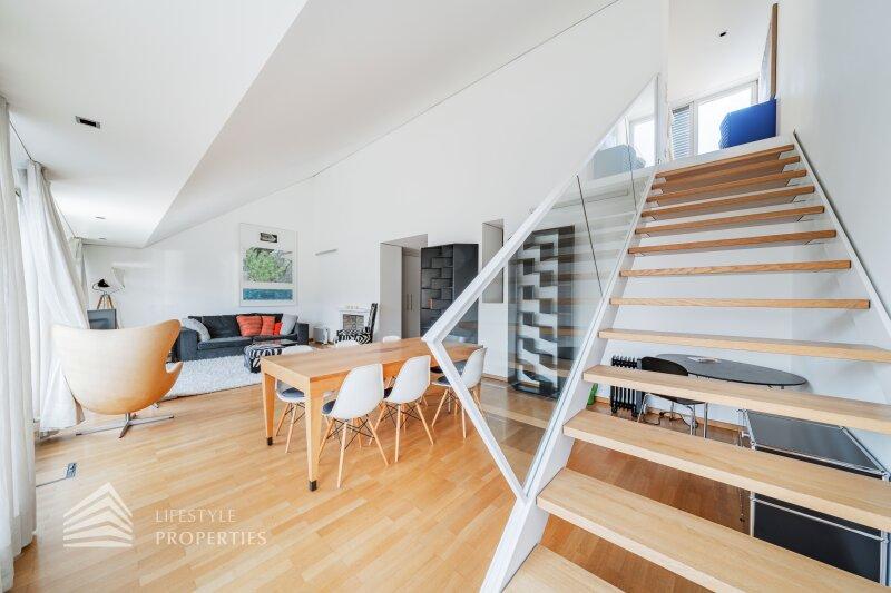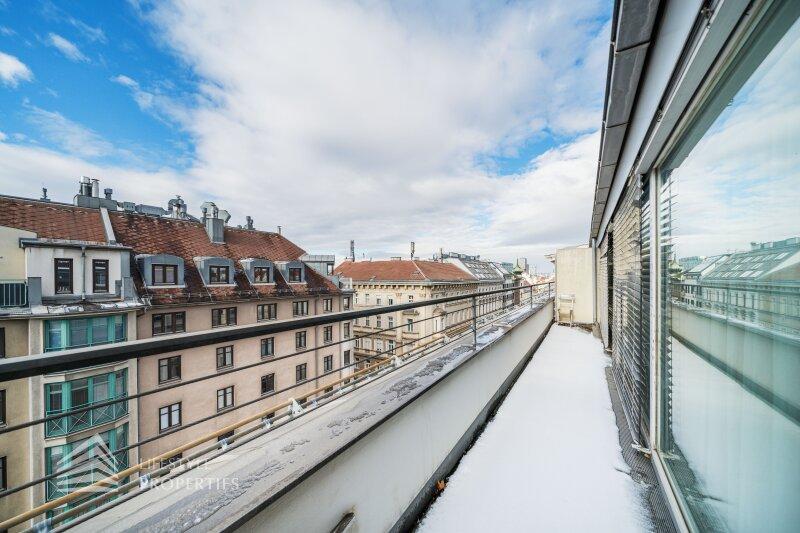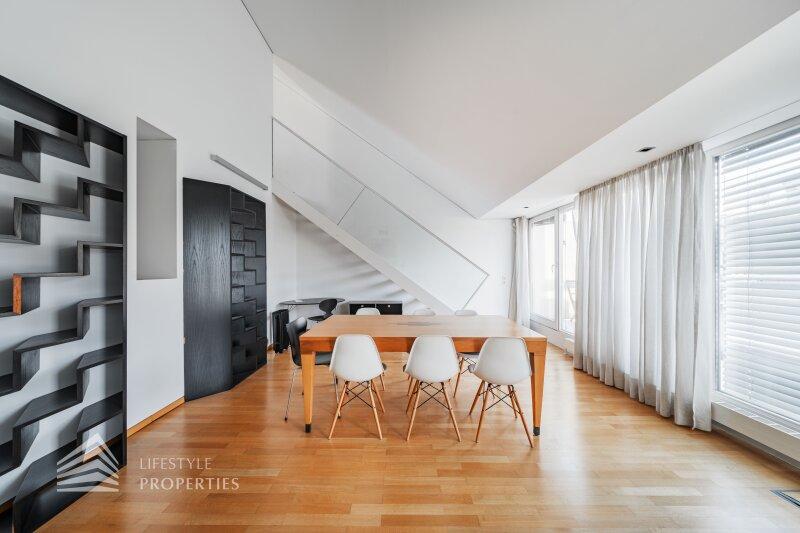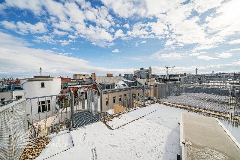 Bei Betreten der Wohnung gelangen Sie in den ca. 3 m² großen Vorraum. Links von Ihnen befindet sich das ca. 5 m² große, mit Badewanne, Waschtisch und Waschmaschinenanschluss ausgestattete, Badezimmer. Rechts von Ihnen befindet sich das WC. Der Vorraum führt Sie gerade hindurch in die moderne Küche, welche geschickt vom Wohnraum abgetrennt ist, aber dennoch dank einem gut geplanten Wanddurchbruch wie eine offen gestaltete Wohnküche wirkt. Vis-à-vis der Küche ist eine große Nische, welche Platz für einen riesigen Einbauschrank und genug Stauraum bietet. Den lichtdurchfluteten Wohnraum erreichen Sie, wenn Sie vom Vorraum gerade an der Küche vorbeigehen. Auf einer Fläche von ca. 44 m² haben Sie genügend Platz für einen großen Esstisch und eine gemütliche Sofalandschaft. Der Raum wird von einer Fensterfront ganztägig mit viel Licht durchflutet. Hinter der Glasfront verbirgt sich eine der Terrassen. Sie können diese über den Wohnraum betreten. Auf der ca. 12 m² großen Terrasse, welche sich über die gesamte Wohnlänge erstreckt, haben Sie ausreichend Platz für einen gemütlichen Frühstückstisch und weitere Möbel um die frische Luft genießen zu können. Zurück im Wohnraum, über die Treppe gelangen Sie in das nächste Geschoss. Die Treppe führt Sie direkt in das ca. 17 m² große Schlafzimmer. Das zugehörige Badezimmer, welches mit einer Dusche, einem Waschbecken und einer Toilette ausgestattet ist, kann direkt vom Schlafzimmer aus betreten werden. Im Schlafzimmer können Sie einen kleinen Arbeitsbereich mit einem Schreibtisch und einen Schlafbereich mit einem großes Bett schaffen. Die Fensterfront, welches den kompletten Raum mit viel natürlichem Licht durchflutet sorgt für eine angenehme Wohlfühlatmosphäre. Von dem Schlafzimmer können Sie die ruhige Richtung Innenhof gelegene ca. 14 m² große Terrasse sowie das absolute Highlight der Wohnung betreten. Eine Wendeltreppe führt Sie von der Terrasse auf die ca. 12 m² große Dachterrasse, welche Ihnen einen 360° Stadtblick über die Dächer Wiens bietet. Hier können Sie Ihre Wohlfühloase mitten in Wien errichten.