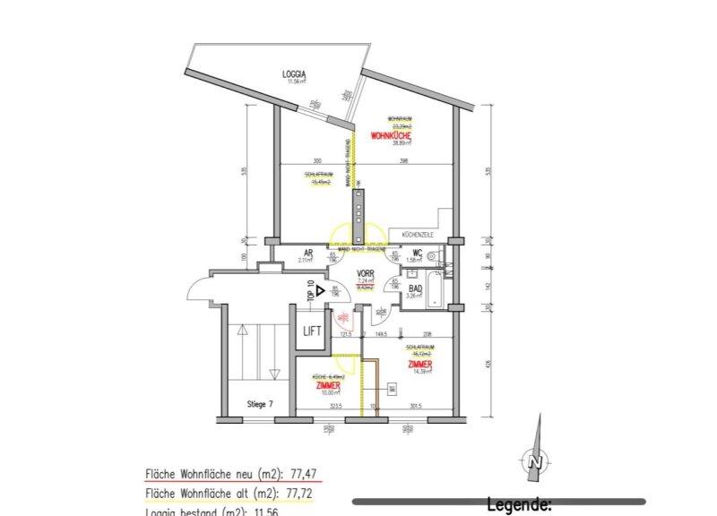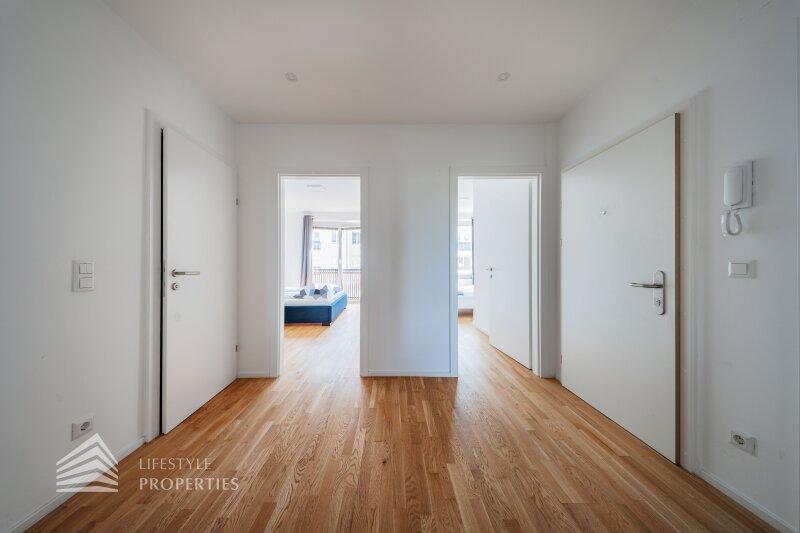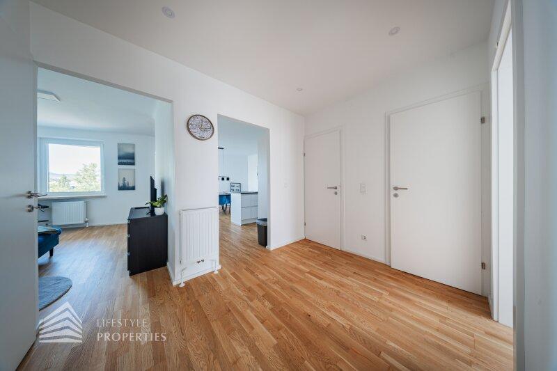 Bei Betreten der Wohnung gelangen Sie in den zentral gelegenen Eingangsbereich, welcher alle Räumlichkeiten miteinander verbindet. Das Herzstück der Wohnung bildet die offene Wohnküche mit ca. 39 m², die nicht nur viel Platz bietet, sondern auch komplett ausgestattet ist und somit direkt genutzt werden kann. Über die Wohnküche gelangen Sie zum Highlight der Wohnung. Zur geräumigen Loggia mit ca. 12 m², die zum Entspannen und Verweilen einlädt. Gegenüber der Wohnküche gelangen Sie in die zwei weiteren Zimmer, welche sich mit ca. 10 m² und ca. 14 m² optimal als Schlaf- oder Arbeitszimmer anbieten. Über den Vorraum erreichen Sie die restlichen Räumlichkeiten. Das moderne Badezimmer ist mit einer Badewanne ausgestattet, und das separate WC bietet zusätzlichen Komfort. Ein praktischer Abstellraum sorgt zudem für ausreichend Stauraum.