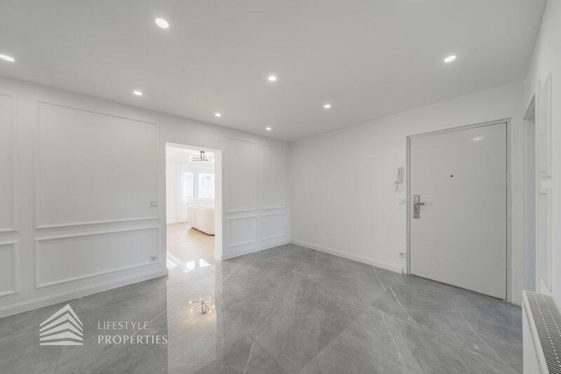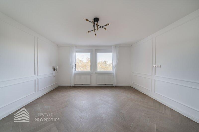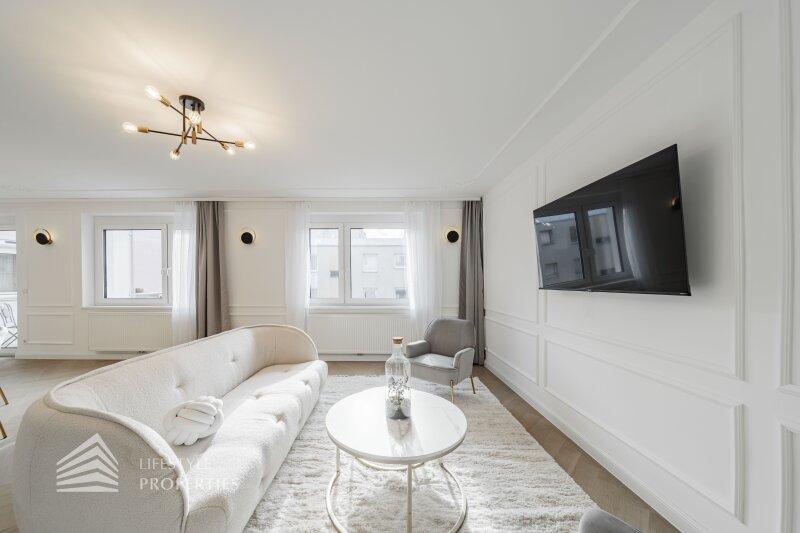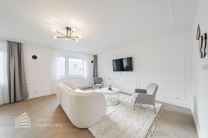 Die Immobilie befindet sich im vierten Liftstock eines im Jahr 1970 erbauten Hauses und weist eine Wohnfläche von ca. 123 m² auf. Die Wohnung teilt sich in einen Vorraum, eine Wohnküche, drei weitere Zimmer, zwei Bäder, ein Gäste-WC, einen Abtstellraum und einen Balkon auf. Die Haupträume sind mit wunderschönem Fischgrätparkett ausgelegt, der Vorraum, der Küchenbereich und die Nassräume sind mit hochwertigen Fliesen ausgekleidet. Die Wohnung verfügt über ein modernes Smart Home System. Es handelt sich um einen Erstbezug. Eine Waschküche im Keller und ein trockenes Kellerabteil sind ebenfalls vorhanden.