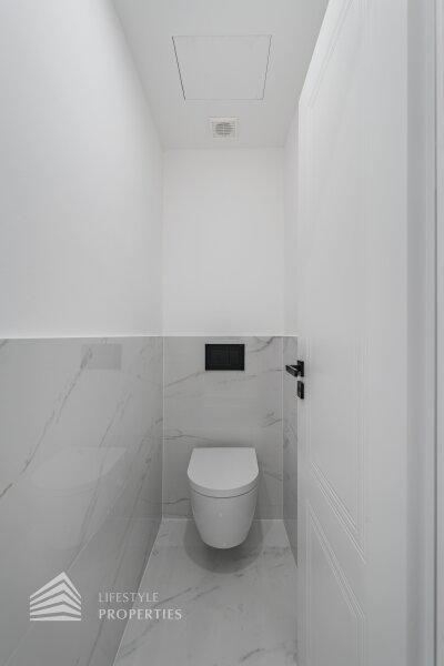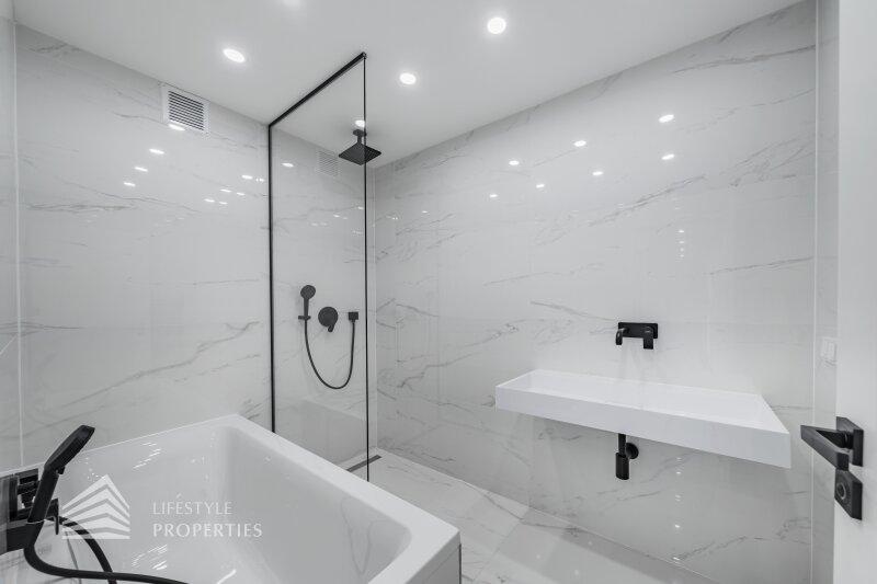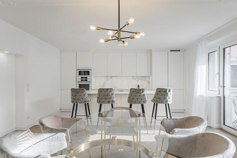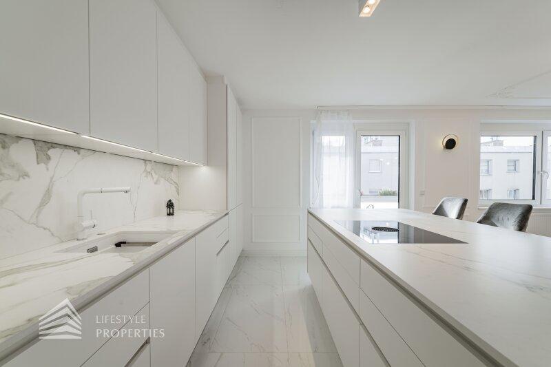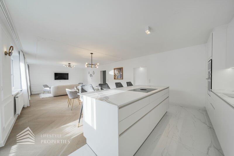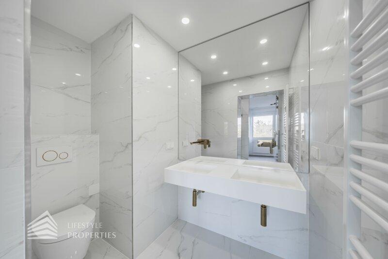 Sie betreten die Wohnung und gelangen in den großzügigen Vorraum, der genügend Platz für eine Garderobe bietet. Rechts finden Sie das Herzstück dieser eleganten Wohnung vor, die ca. 54 m² große Wohnküche mit Zugang zum ca. 4 m² großen Balkon, der Platz für eine gemütliche Sitzgelegenheit zum Entspannen bietet. Die Designerküche ist mit hochwertigen Geräten der Marke Siemens ausgestattet und bietet viel Stauraum. Gegenüber finden Sie die drei weiteren Zimmer vor. Ganz rechts befindet sich das mit ca. 18 m² größte der drei Zimmer, in dem Sie ausreichend Platz für ein großes Bett und einen Kleiderschrank finden. Das Badezimmer en Suite ist mit einer wunderbaren Glasdusche sowie einer Toilette ausgestattet. Hier treffen Sie außerdem auf edle Keramik sowie Designerarmaturen. Das zweite Zimmer bietet mit ca. 10 m² Fläche Platz für ein weiteres Schlafzimmer. Das dritte, etwas kleinere Zimmer könnte beispielsweise als Arbeitszimmer genutzt werden. Vom Vorraum aus erreichen Sie außerdem das zweite Bad, den Abstellraum und das Gäste-WC. Das luxuriöse Bad ist mit einer Dusche sowie einer Badewanne ausgestattet. Die Wohnung wird mittels Elektroheizung beheizt.