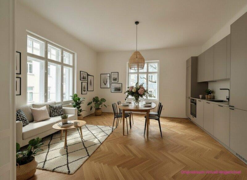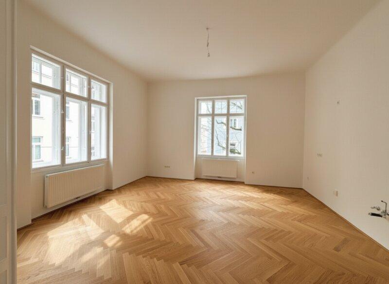 Der Charme dieser wunderschönen Altbauwohnung offenbart sich sofort, wenn man sie durch die original erhaltene Eingangstür betritt. Ein außergewöhnlicher, aber umso gefälligerer Grundriss wurde hier geschaffen, weit weg von einer seelenlosen 08/15-Raumaufteilung. Mit insgesamt knapp 70m² Wohnfläche ist die Wohnung äußerst großzügig. Das Vorzimmer besticht bereits durch ausreichend Platz und die vielen schönen alten Türen, die von hier in die weiteren Räume führen. Sowohl Bad als auch WC wurden bei der Generalsanierung vollständig erneuert und geschmackvoll und zeitlos mit grauen und weißen großflächigen Fliesen und hochwertiger Keramik ausgestattet. Gleich 2 getrennte Abstellräume - einer mit Waschmaschinenanschluss - sind zum Verstauen von Haushaltsgerät gedacht. Das Highlight der Wohnung sind die beiden prächtigen Wohnräume mit ihren großen Atelier-Fenstern und dem schönen Blick in den begrünten Hof. Ein Zimmer ist als Wohnküche gedacht, hier sind die Anschlüsse bereits vorbereitet und man kann eine Küche ganz nach seinen Vorstellungen verwirklichen. Das Schlafzimmer ist ebenfalls sehr hell und mit 22m² überdurchschnittlich großzügig. Beheizt wird die Wohnung mittels Gas-Etagenheizung.