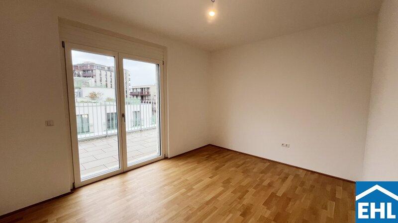 Eichenparkettböden, Holz-Alu-Fenster und Außenjalousien schaffen ein stilvolles Ambiente mit natürlicher Wärme. Dank Smart-Home-Vorbereitung, Fußbodenheizung und Raumkühlung über Bauteilaktivierung genießen Bewohnerinnen und Bewohner ein ausgewogenes Wohnklima zu jeder Jahreszeit.