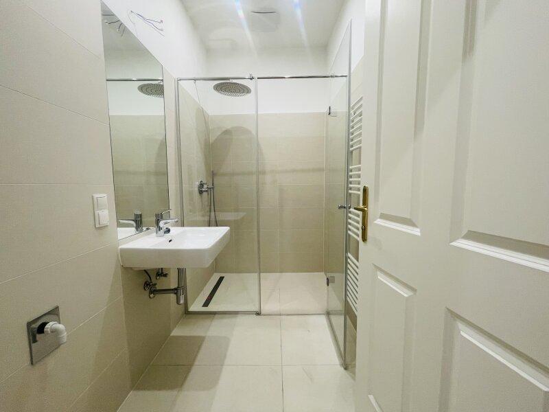 - Das Badezimmer verfügt über eine Dusche, Waschbecken sowie einen Waschmaschinenanschluss.