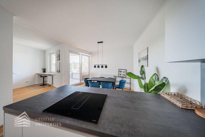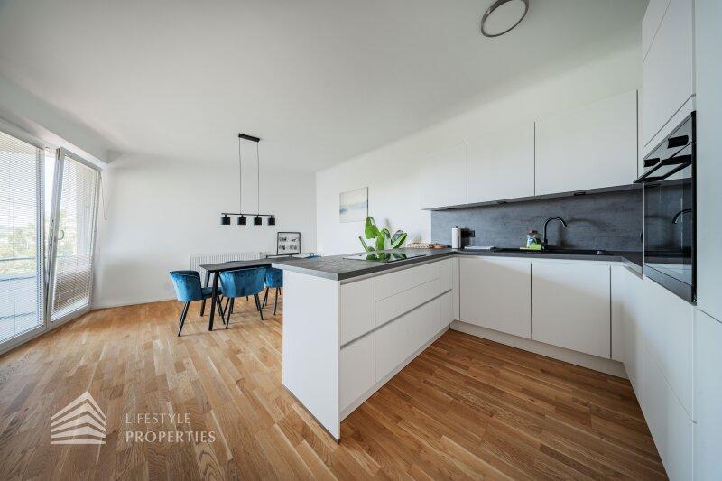 Bei Betreten der Wohnung gelangen Sie in den zentral gelegenen Eingangsbereich, welcher alle Räumlichkeiten miteinander verbindet. Das Herzstück der Wohnung bildet die offene Wohnküche mit ca. 39 m², die nicht nur viel Platz bietet, sondern auch komplett ausgestattet ist und somit direkt genutzt werden kann. Über die Wohnküche gelangen Sie zum Highlight der Wohnung. Zur geräumigen Loggia mit ca. 12 m², die zum Entspannen und Verweilen einlädt. Gegenüber der Wohnküche gelangen Sie in die zwei weiteren Zimmer, welche sich mit ca. 10 m² und ca. 14 m² optimal als Schlaf- oder Arbeitszimmer anbieten. Über den Vorraum erreichen Sie die restlichen Räumlichkeiten. Das moderne Badezimmer ist mit einer Badewanne ausgestattet, und das separate WC bietet zusätzlichen Komfort. Ein praktischer Abstellraum sorgt zudem für ausreichend Stauraum.