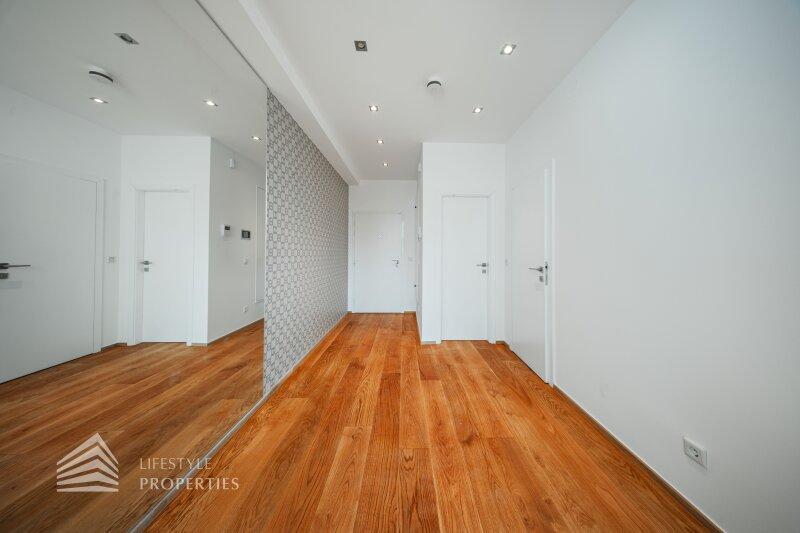 Der traumhafte Neubau liegt im Dachgeschoss und ist bequem mit dem Lift zu erreichen. Er erstreckt sich über eine Wohnfläche von ca. 223 m² und teilt sich wie folgt auf: sechs Zimmer, vier Bäder, vier WC sowie zwei Abstellräume. Die Haupträume sind mit hochwertigen Eichenholzdielen ausgekleidet, die Nassräume sind mit beigen Marmor gefliest. Die Highlights dieser Immobilie sind zweifelsohne die Dachterrasse sowie das begehbare Flachdach mit traumhafter Aussicht. Zusätzlich kann man einen Garagenstellplatz im Haus um 100.000.- Euro erwerben.