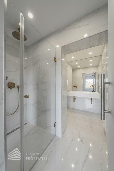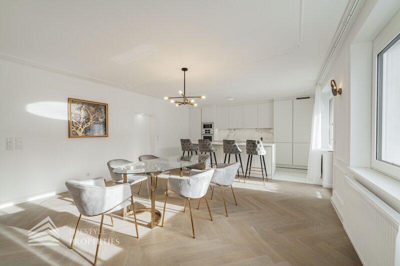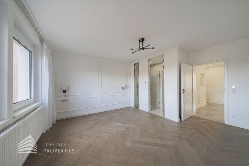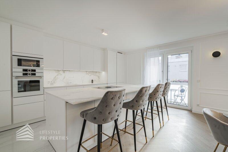 Sie betreten die Wohnung und gelangen in den großzügigen Vorraum, der genügend Platz für eine Garderobe bietet. Rechts finden Sie das Herzstück dieser eleganten Wohnung vor, die ca. 54 m² große Wohnküche mit Zugang zum ca. 4 m² großen Balkon, der Platz für eine gemütliche Sitzgelegenheit zum Entspannen bietet. Die Designerküche ist mit hochwertigen Geräten der Marke Siemens ausgestattet und bietet viel Stauraum. Gegenüber finden Sie die drei weiteren Zimmer vor. Ganz rechts befindet sich das mit ca. 18 m² größte der drei Zimmer, in dem Sie ausreichend Platz für ein großes Bett und einen Kleiderschrank finden. Das Badezimmer en Suite ist mit einer wunderbaren Glasdusche sowie einer Toilette ausgestattet. Hier treffen Sie außerdem auf edle Keramik sowie Designerarmaturen. Das zweite Zimmer bietet mit ca. 10 m² Fläche Platz für ein weiteres Schlafzimmer. Das dritte, etwas kleinere Zimmer könnte beispielsweise als Arbeitszimmer genutzt werden. Vom Vorraum aus erreichen Sie außerdem das zweite Bad, den Abstellraum und das Gäste-WC. Das luxuriöse Bad ist mit einer Dusche sowie einer Badewanne ausgestattet. Die Wohnung wird mittels Elektroheizung beheizt.