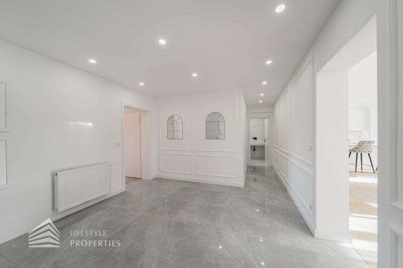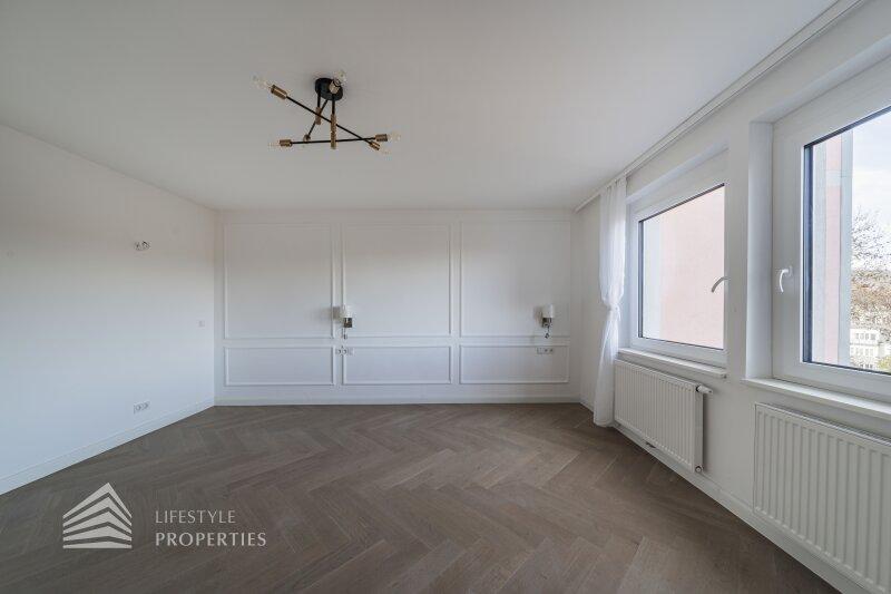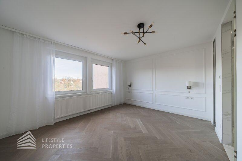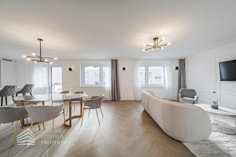 Die Immobilie befindet sich im vierten Liftstock eines im Jahr 1970 erbauten Hauses und weist eine Wohnfläche von ca. 123 m² auf. Die Wohnung teilt sich in einen Vorraum, eine Wohnküche, drei weitere Zimmer, zwei Bäder, ein Gäste-WC, einen Abtstellraum und einen Balkon auf. Die Haupträume sind mit wunderschönem Fischgrätparkett ausgelegt, der Vorraum, der Küchenbereich und die Nassräume sind mit hochwertigen Fliesen ausgekleidet. Die Wohnung verfügt über ein modernes Smart Home System. Es handelt sich um einen Erstbezug. Eine Waschküche im Keller und ein trockenes Kellerabteil sind ebenfalls vorhanden.