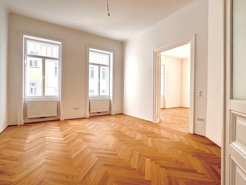 Flügeltüren, Fischgrät-Parkett und überdurchschnittlich hohe Räume im gutbürgerlichen 18. Bezirk - hier schlagen die Herzen von AltbauliebhaberInnen in der Sekunde höher! Die soeben frisch sanierte 2-Zimmer-Wohnung in einem klassischen Altbau aus dem Jahre 1904 liegt im 1. Stock mit Hochparterre, ein Lift ist gerade in Planung. Sie ist hell und wurde mit viel Liebe aufwändig und vollständig saniert und bietet modernen Wohnkomfort in altehrwürdigen Mauern. Bei der Sanierung wurde großes Augenmerk darauf gelegt, Altes zu erhalten und mit Neuem so zu ergänzen, dass sich ein harmonisches Ganzes ergibt, was man beim Betreten der Wohnung sofort spürt. Die wunderschönen großen Holzkastenfenster und originalen Flügeltüren wurden alle erhalten und neu in Stand gesetzt, was der Wohnung ein unvergleichlich schönes und großzügiges Atelier-Flair verleiht!