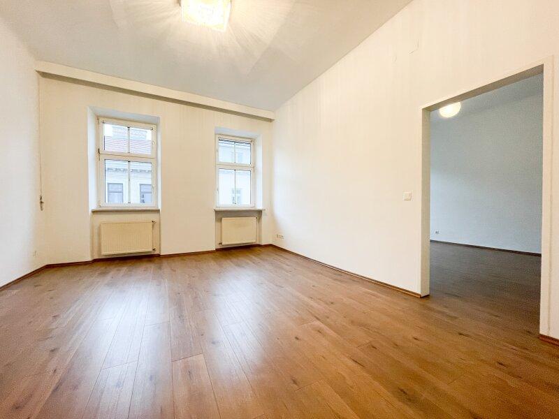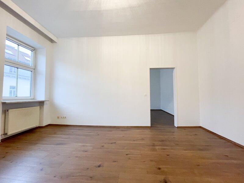 Zwei großzügige, nahezu quadratische Zimmer mit beeindruckenden, typischen Altbaudecken schaffen ein luftiges Wohngefühl und bieten vielseitige Nutzungsmöglichkeiten ob als Wohn-, Schlaf- oder Arbeitszimmer. Die Ausrichtung Richtung Webergasse sorgt für eine freundliche Atmosphäre.