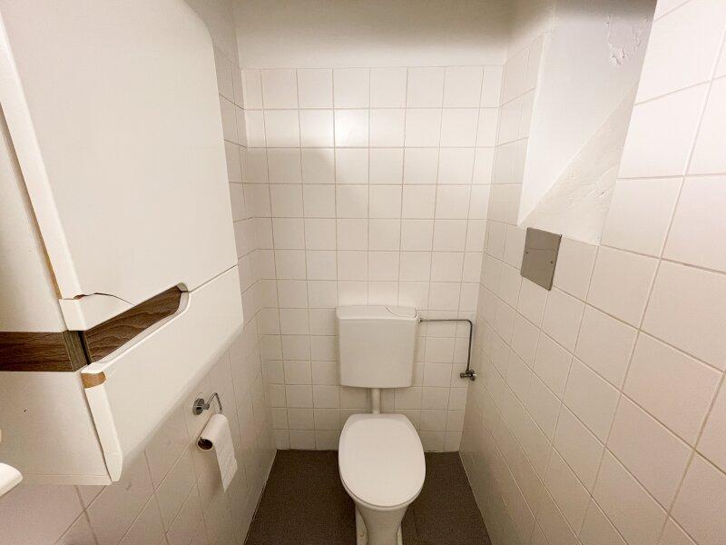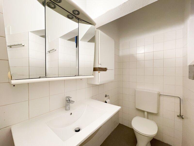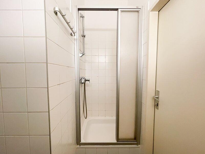 Das Badezimmer mit WC ist funktional gestaltet und verfügt über eine Dusche sowie ein Fenster zum Lichthof, das für angenehme natürliche Belüftung sorgt.