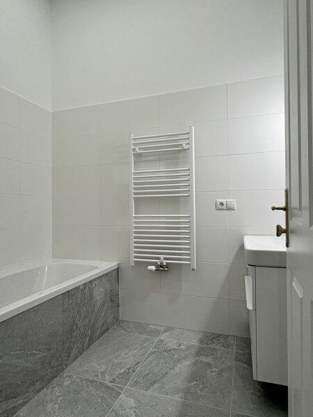 • neues Badezimmer mit Badewanne, hochwertigem Waschtisch und Handtuchtrockner