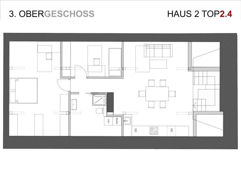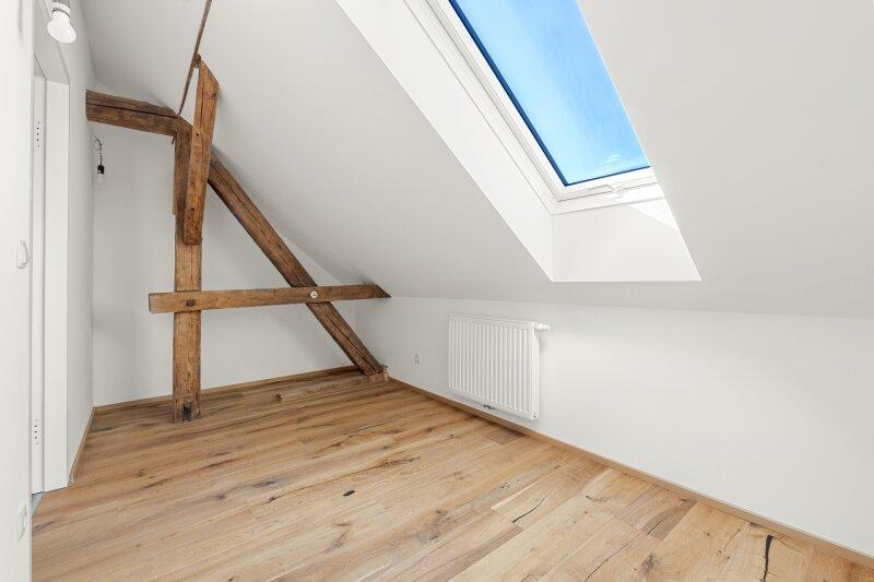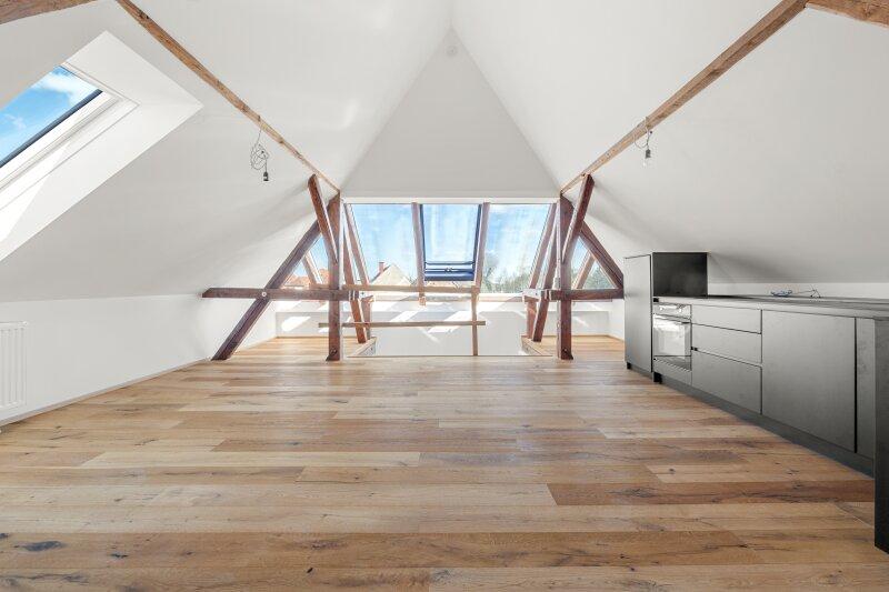 Treten Sie ein und entdecken Sie diese exquisite Maisonette - Dachgeschosswohnung, diese sich auf 85,57m² erstreckt. Vom Eingangsbereich gelangen Sie in das großzügige Wohn- Essbereich. Vom Essbereich aus, kommen Sie in die jeweiligen zwei Zimmer, diese Sie zum einen als Schlafzimmer und zum anderen als Kinder- oder Ankleidezimmer, sowie Büro nutzen können. Vom Gang gelangen Sie ebenso zum Badezimmer, samt WC, Waschbecken und einer Badewanne, die zum Verweilen einlädt.