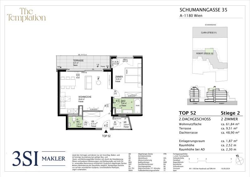 Optional ist ein Garagenplatz in der hauseigenen Tiefgarage um EUR 43.000,00 für Eigennutzer / EUR 38.790,00 für Anleger erwerbbar.