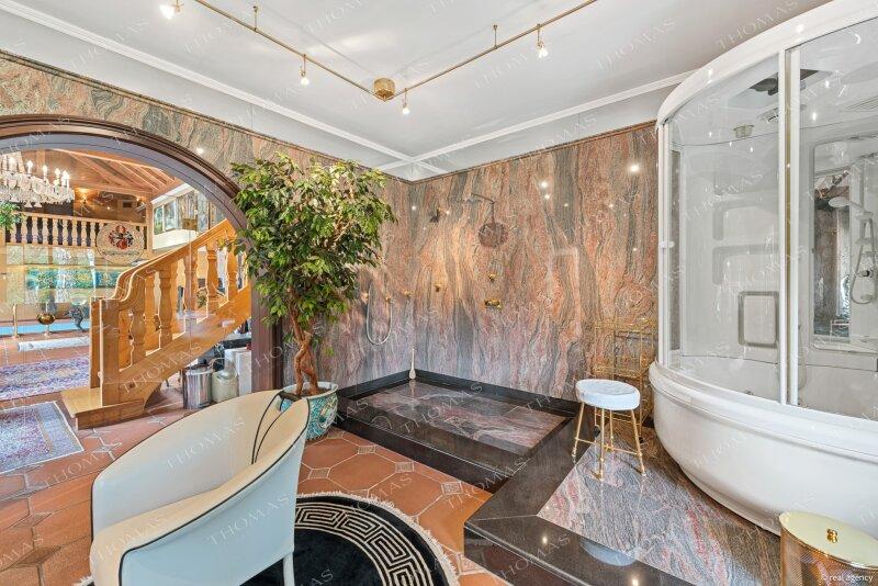 The upper level hosts the master suite with dressing room, luxurious granite-clad en suite bathroom, private roof terrace, and direct access to the wellness wing.