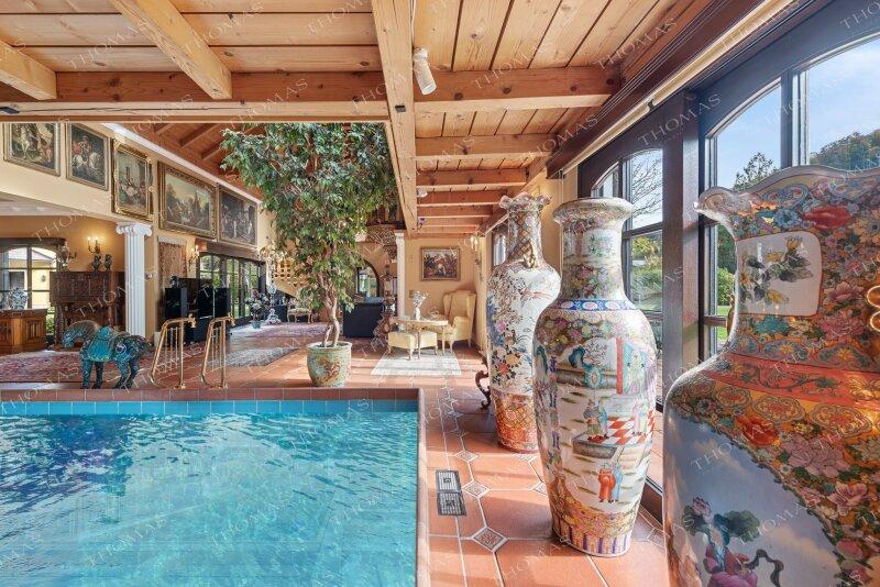 The spectacular annex offers a heated indoor pool, sauna, steam bath, fireplace lounge, and an open gallery an ideal setting for a private gym or relaxation area.