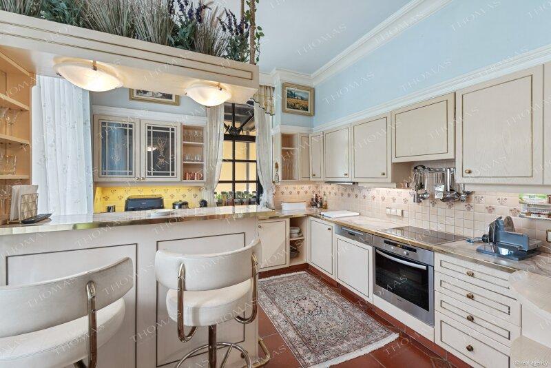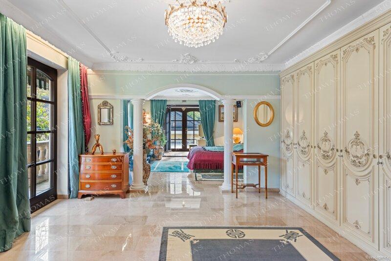 Ein eindrucksvolles Entrée führt in den 76 m² großen Wohn- und Esssalon mit Stuckdekor und Zugang zur Terrasse mit Blick in den weitläufigen Garten. Das Obergeschoss beherbergt den Masterbereich mit Ankleide, Granitbad en suite, privater Dachterrasse und direktem Zugang zum Wellnesstrakt.
