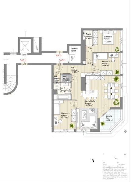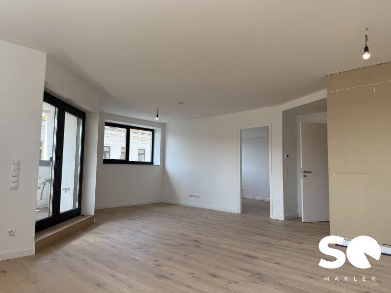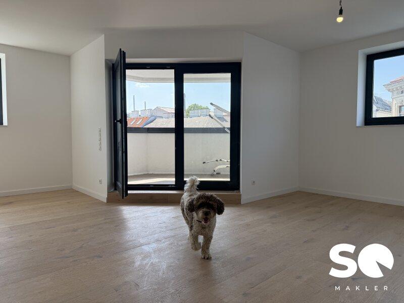 Ausstattung: Premium-Vollholzdielen in elegantem Weiß geölt, hochwertige moderne Fenster (Wärme- und Schallschutz), und Loggia mit Wohlfühlfaktor.