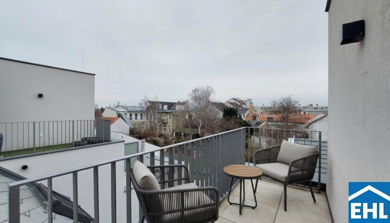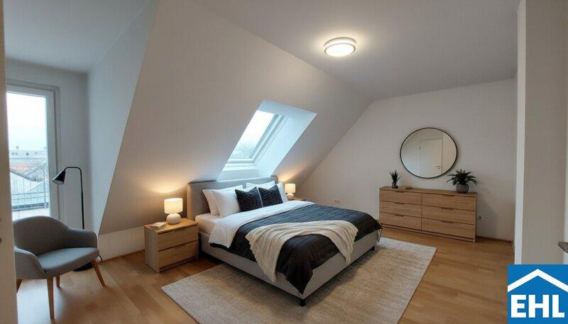 Die Wohnung selbst befindet sich im 1. Dachgeschoß und verfügt über eine Wohnküche, zwei Schlafzimmer, ein Badezimmer mit Dusche, WC und Waschmaschinenanschluss, ein separates WC, sowie einen Vorraum. Zwei Balkone runden das Wohnerlebnis ab.