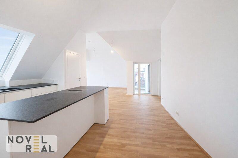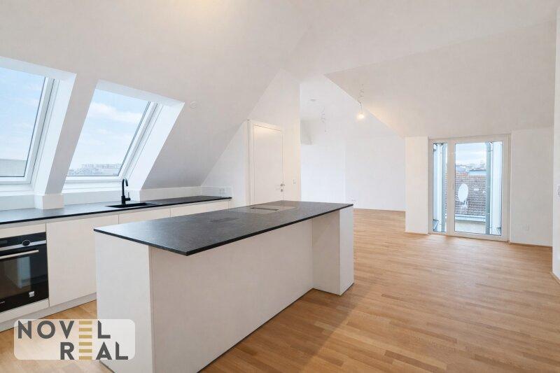 Die offene Wohnküche ist designorientiert gestaltet und lädt zum Wohlfühlen ein, ideal für gesellige Abende oder entspannte Stunden. Ein direkter Zugang führt hinaus auf die große Terrasse, die einen beeindruckenden Blick über Wien eröffnet und als exklusiver Rückzugsort mitten in der Stadt dient.