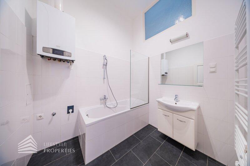 Sie betreten die Wohnung und befinden sich im Vorraum, gerade durch gelangen Sie in die voll ausgestattete Küche. Von hier gelangen Sie einerseits in das helle Wohnzimmer und in das Schlafzimmer. Das Badezimmer ist mit einer Badewanne, einem Handtuchtrockner, einem Waschmaschinenanschluss und einem Waschbecken ausgestattet. Das separate WC befindet sich auch im Vorraum. Die Wohnräume sind mit schönem Parkettboden ausgestattet und die Nassräume und die Küche sind verfliest.