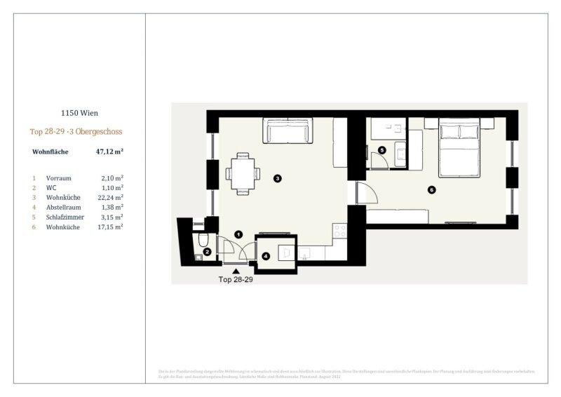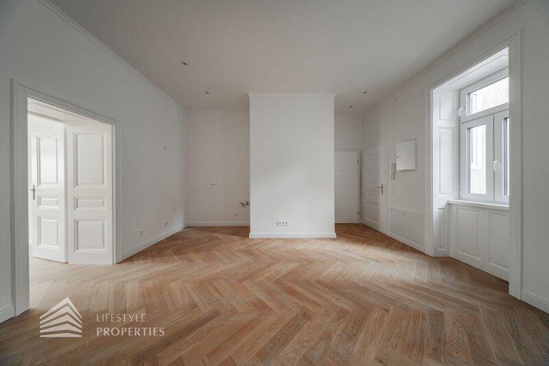 Die Wohnung ist ein Erstbezug, verfügt über ca. 47 m² und befindet sich im 3. Stock eines schönen Altbaus und gliedert sich in eine Wohnküche, ein Zimmer, einen Abstellraum, ein Badezimmer und ein separates WC. Die Wohnräume sind mit schönem Parkettboden ausgestattet, Bad und WC sind verfliest.
