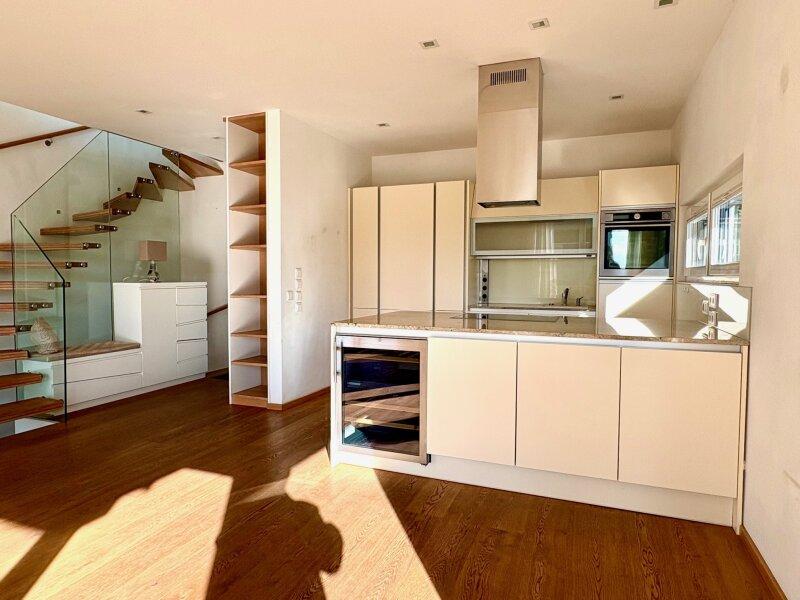 • Offene Wohnküche (Markenküche von DAN mit hochwertigen Geräten von AEG - Großflächeninduktionsherd, Backrohr mit Dampfgar-Funktion, Weinkühler, Küchenradio, etc.)