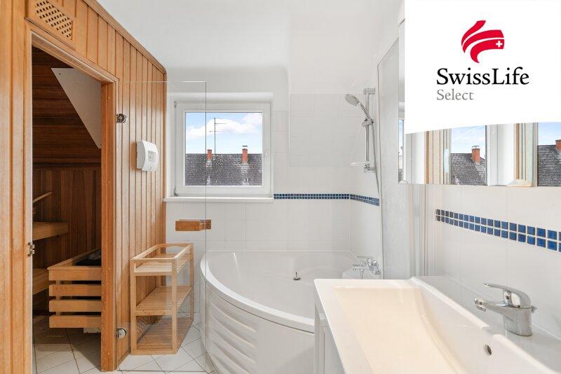 + Badezimmer mit Badewanne, Waschbecken und integrierter Sauna