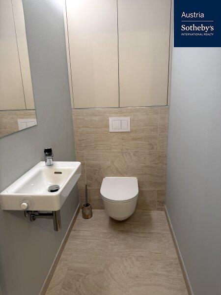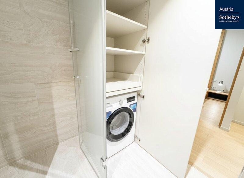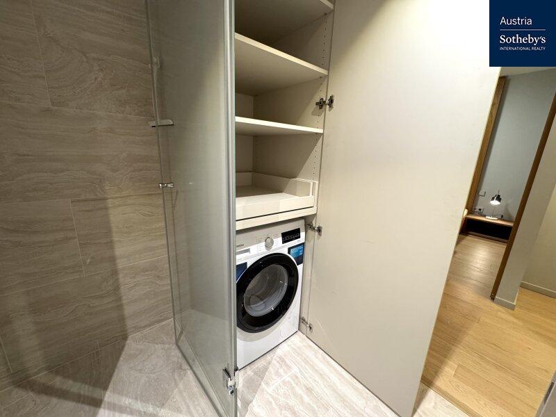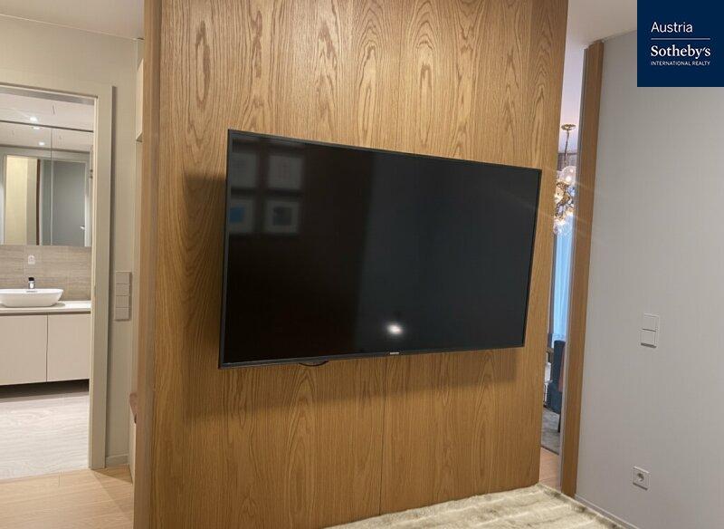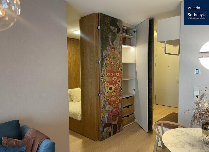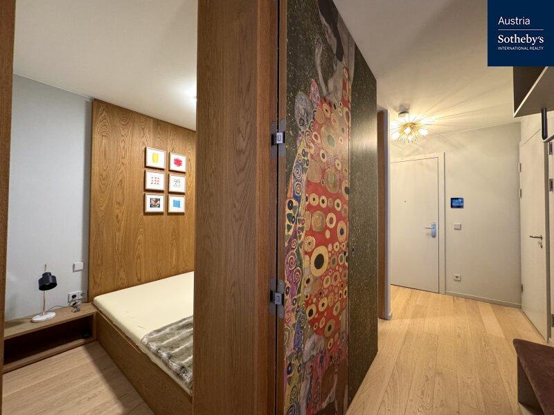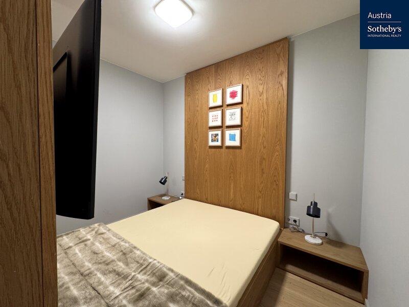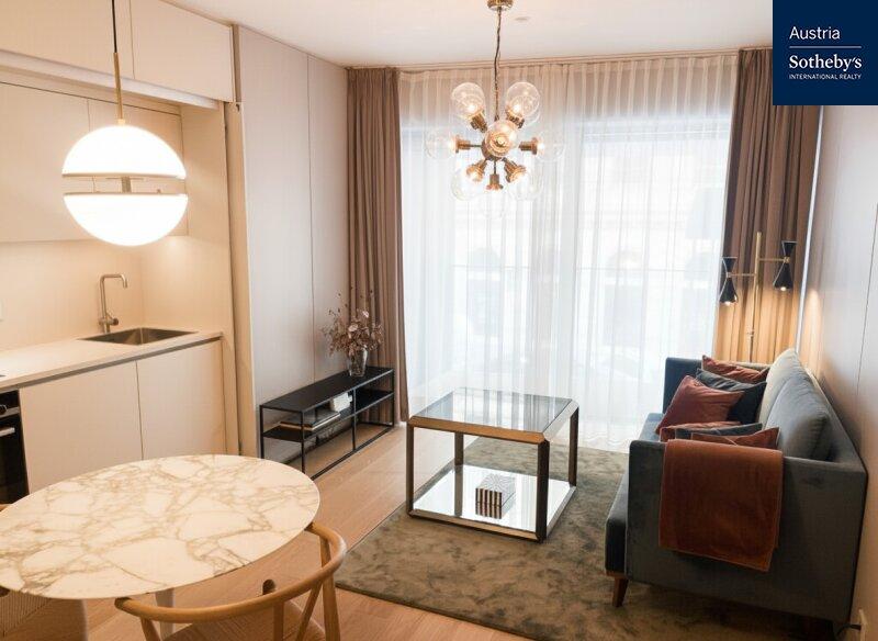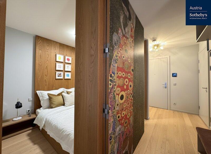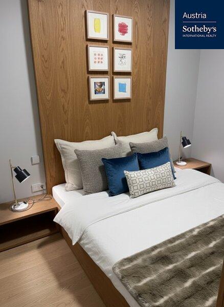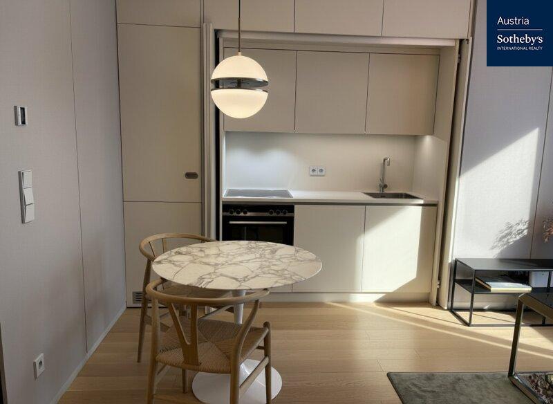 Die im 1. Obergeschoß gelegene Wohnung überzeugt durch ein architektonisch durchdachtes Raumkonzept sowie ein harmonisch abgestimmtes Farb- und Einrichtungskonzept, das von einem Architekten geplant und umgesetzt wurde. Design, Funktionalität und Ästhetik verbinden sich hier zu einem stimmigen Gesamtbild. Die intelligente Grundrisslösung schafft eine elegante Trennung der Bereiche und verleiht der Wohnung ein überraschend großzügiges Raumgefühl: Die hochwertig ausgestattete Küche verschwindet bei Bedarf hinter schlichten, raumhohen Schiebetüren und integriert sich nahtlos in den Wohnraum oder tritt dezent in den Hintergrund. Auch der Schlafbereich ist raffiniert hinter designprägenden Schiebeelementen verborgen, die von außen wie ein modernes Kunstobjekt wirken. So entsteht ein flexibel nutzbarer Wohnraum mit klarer Struktur, urbanem Charakter und außergewöhnlicher Ästhetik. Das Badezimmer ist mit einer Walk-in-Dusche inklusive Regenduschkopf sowie hochwertigen Armaturen ausgestattet. Helle Fliesen und elegante Keramikelemente unterstreichen den modernen Stil. Die Toilette ist separat begehbar. Die südöstlich ausgerichtete Loggia mit bodentiefen Fensterflächen sorgt für ein helles, freundliches Wohnambiente und erweitert den Wohnraum nach außen. Hier lässt sich ein stilvoller Sitzbereich für warme Sommertage gestalten. Die gesamte Wohnung ist vollklimatisiert und garantiert auch in den Sommermonaten ein angenehmes Raumklima. Die Wohnung wurde kürzlich fertiggestellt, seither nicht bewohnt und präsentiert sich in neuwertigem Zustand.