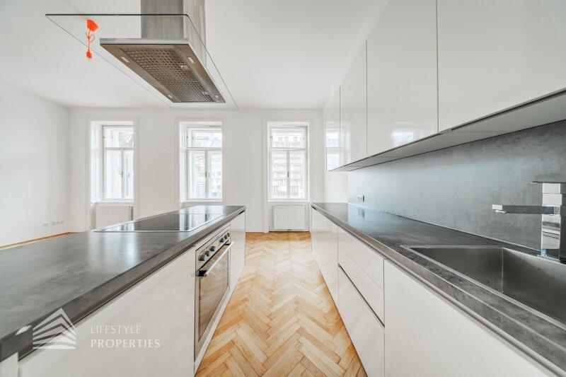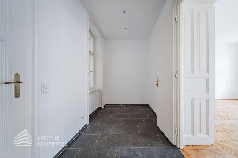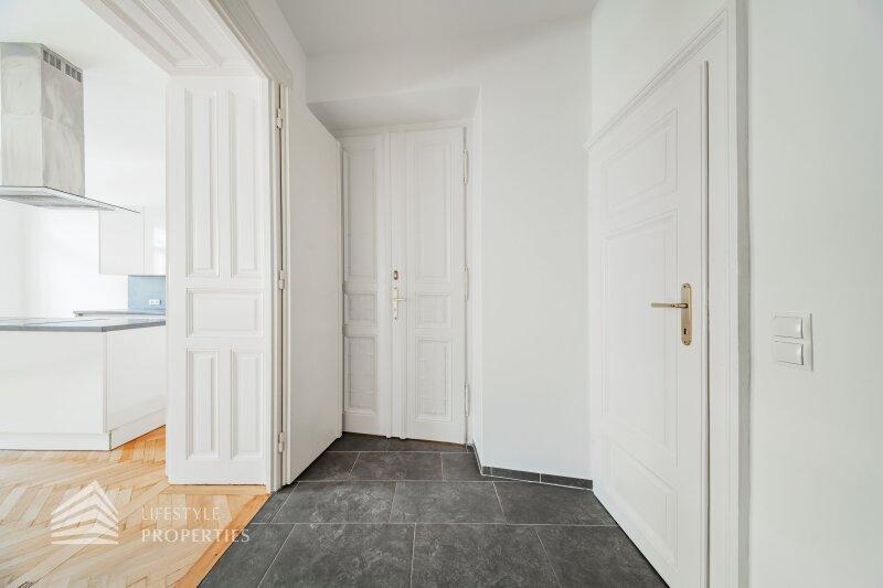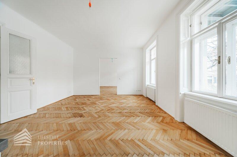 Die Liegenschaft befindet sich im 1. Stock (Mezzanin) und erstreckt sich über eine Fläche von ca. 64,13 m². Die Wohnung vereint typischen Altbaucharakter mit Fischgrätparkett und großen Flügeltüren. Die Wohnung teilt sich in einen Vorraum, ein Badezimmer mit Fenster, 2 Zimmer (inkl. großzügiger Wohnküche mit Kochinsel) sowie eine separate Toilette auf. Zudem wurde gerade ein Lift auf Kosten des Eigentümers installiert.