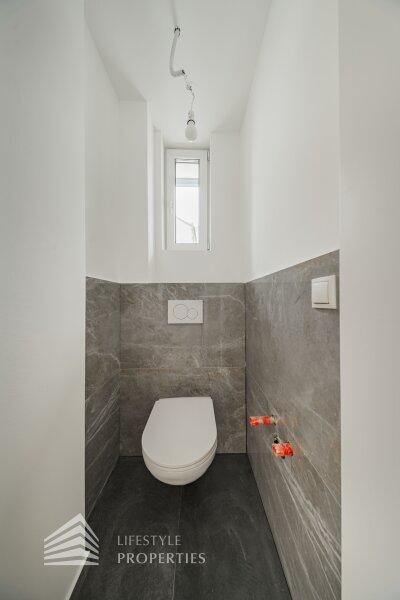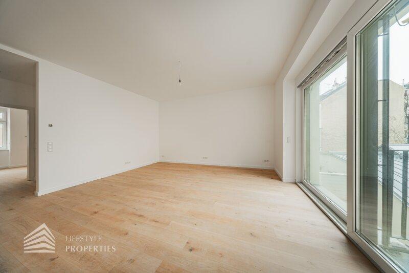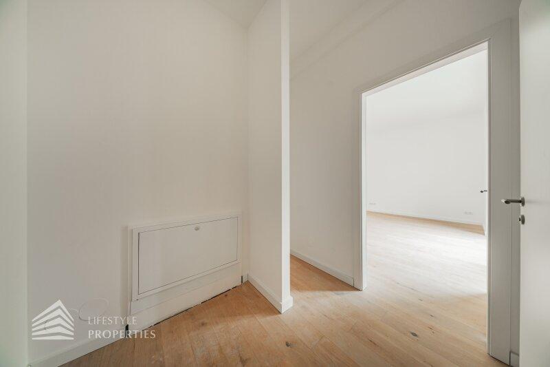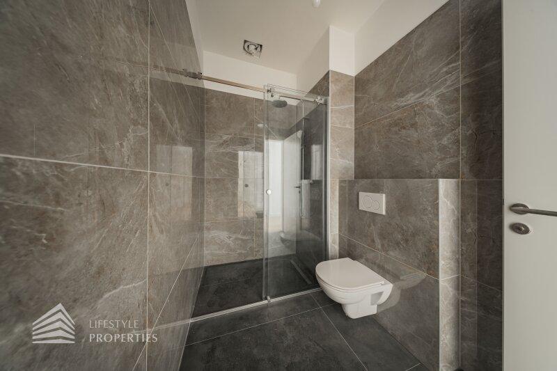 Der Vorraum bietet Platz für eine Garderobe und verfügt über eine praktische Nische mit Anschluss für eine Waschmaschine. Von hier aus gelangt man sowohl in die separate Gäste-Toilette mit Fenster und Handwaschbecken als auch in die großzügige Wohnküche. Die Küchenanschlüsse werden individuell nach Käuferwunsch vorbereitet. Das Highlight der Wohnung ist der süd- und hofseitig ausgerichtete Balkon. Die beiden Zimmer sind zentral begehbar. Das moderne Badezimmer ist mit Dusche, WC und Waschbecken ausgestattet.