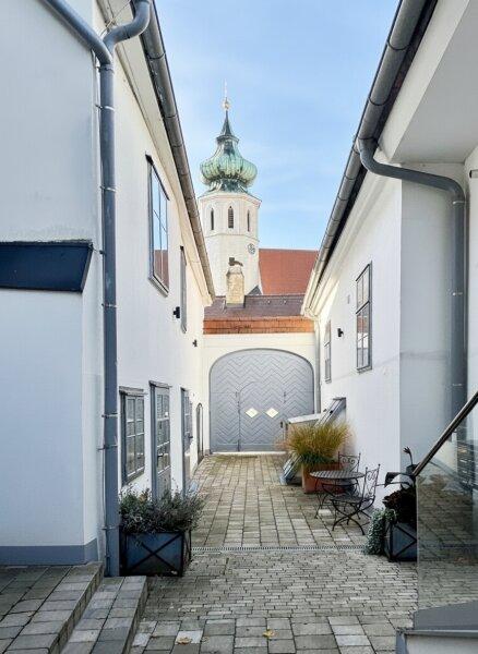 Schon der Zugang in den Innenhof ist beeindruckend - Altes und Neues passen hervorragend zusammen. Dreht man sich um, ergibt sich der Blick Richtung Kirchturm, der im gesamten Ensemble eingebettet zu sein scheint.