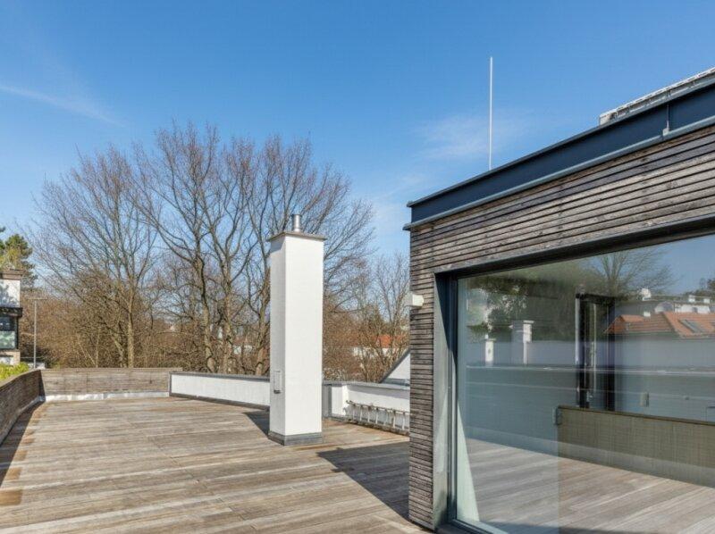 Desweiteren gibt es auch auf dieser Etage ein separates WC, welches sich am Aufgang zur ca. 92 m2 großen Terrasse befindet. Die Terrasse bietet aufgrund ihrer Größe Platz für alles, wovon man Outdoor träumen kann. Richtung Norden wird der Blick von den umliegenden Bäumen geleitet, Richtung Süden kommt erneut der Kirchturm ins Blickfeld.