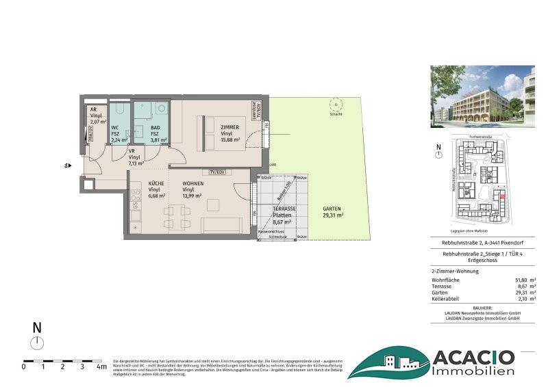 Diese topmoderne Wohnung im Erdgeschoß mit ca. 51,8m² Wohnfläche und ostseitigem Garten verfügt über eine überdachte Terrasse mit Weitblick ins Grüne.