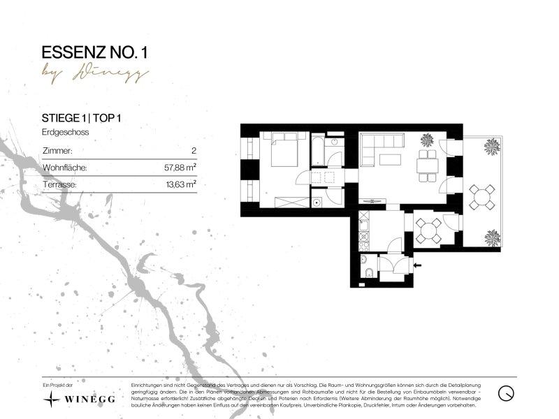 Das 2-Zimmer-Apartment befindet sich im Erdgeschoss und bietet eine Wohnfläche von ca. 58 m² sowie eine Terrasse mit ca. 14 m². Die Raumaufteilung gliedert sich wie folgt: