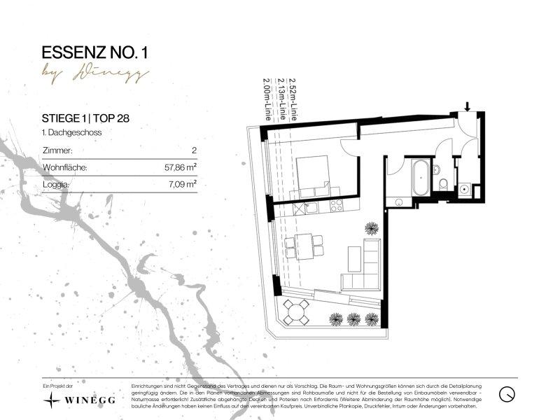 Die 2-Zimmer-Wohnung befindet sich im 1. Dachgeschoss und bietet eine Wohnfläche von ca. 58 m² und eine Loggia mit ca. 7 m². Alle Zimmer sind separat begehbar. Die Raumaufteilung gliedert sich wie folgt: