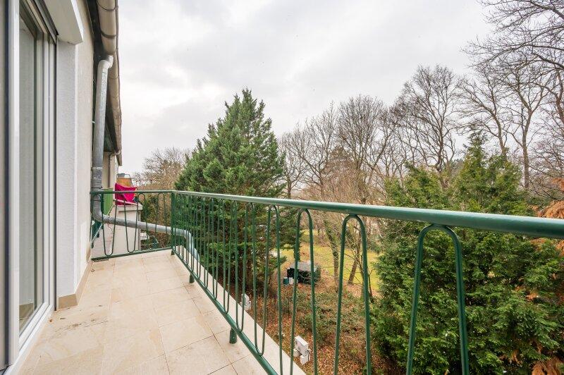 Die Wohnung befindet sich in der Bujattigasse, 1140 Wien, und bietet eine idyllische, ruhige Umgebung, einschließlich eines kleinen Baches und viel Grün direkt vor der Haustür.