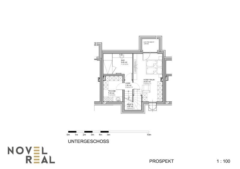 Ein besonderes Augenmerk wurde der optimalen Raumnutzung geschenkt und somit wird auch das Untergeschoß zu einem schlüsselfertigem und beheiztem Wohnkeller (mit Freifläche) ausgebaut, welcher neben Wirtschafts-/Technik- und Stauraum auch ein Badezimmer und ein weiteres Zimmer bietet, welches durch einen großen Lichtschacht mit doppelflügeliger Glastüre und einem Kellerfenster über ausreichend Belichtung und Belüftung verfügt.