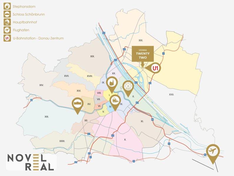 Gegenüber dem Donau Zentrum und der U-Bahnlinie U1 entsteht das neue Quartier VIENNA TWENTYTWO mit erstklassiger Infrastruktur und Verkehrsanbindung.