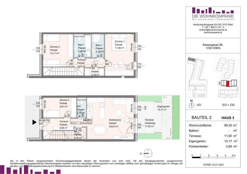 Das Haus verfügt zudem über eine Terrasse mit ca. 11,50 m², einen Eigengarten mit ca. 15,17 m² sowie ein Kellerabteil mit ca. 2,66 m².