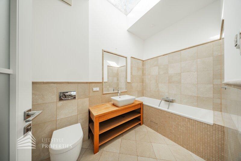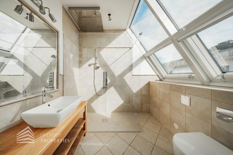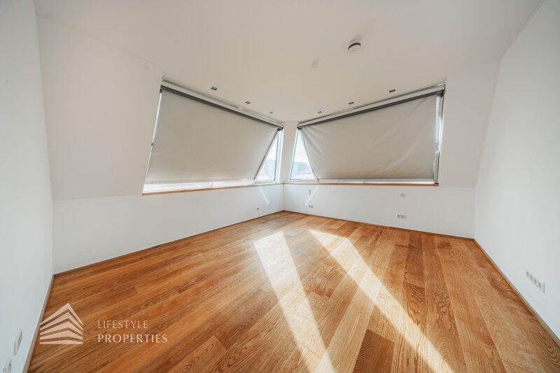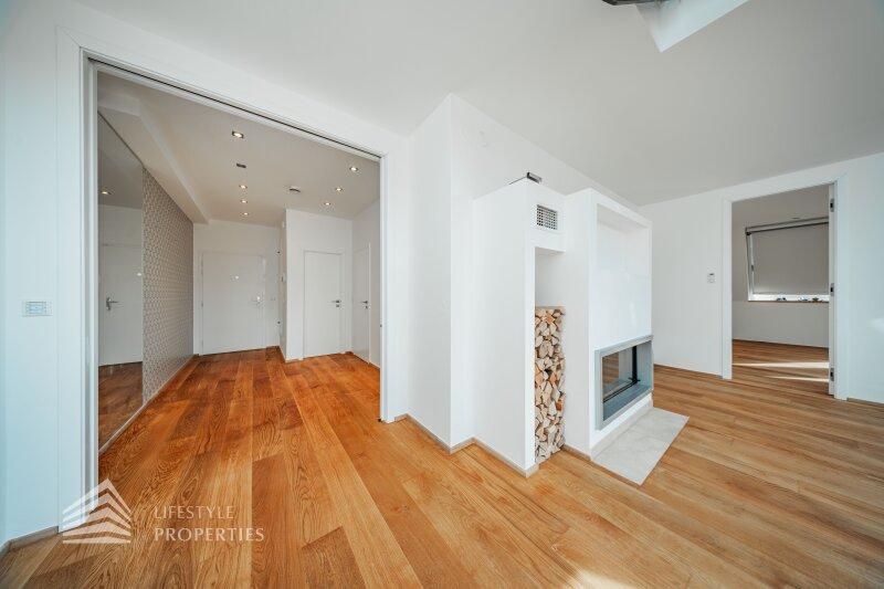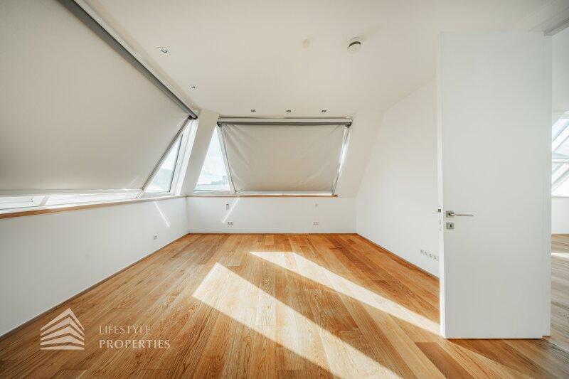 Der traumhafte Neubau liegt im Dachgeschoss und ist bequem mit dem Lift zu erreichen. Er erstreckt sich über eine Wohnfläche von ca. 223 m² und teilt sich wie folgt auf: sechs Zimmer, vier Bäder, vier WC sowie zwei Abstellräume. Die Haupträume sind mit hochwertigen Eichenholzdielen ausgekleidet, die Nassräume sind mit beigen Marmor gefliest. Die Highlights dieser Immobilie sind zweifelsohne die Dachterrasse sowie das begehbare Flachdach mit traumhafter Aussicht. Zusätzlich kann man einen Garagenstellplatz im Haus um 100.000.- Euro erwerben.