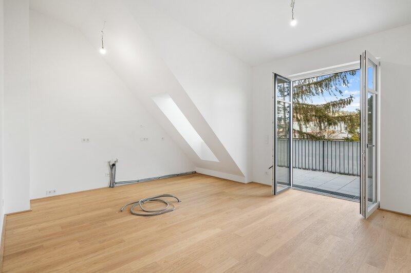 Diese exklusive 4 Zimmer DG-Balkon-Wohnung ist sowohl nach Südwesten (Schlafzimmer 1 und Wohnzimmer, mit Blick auf eine ruhige Seitengasse) als auch Nordosten (Wohnküche samt Balkon und Schlafzimmer 2, mit Blick zum Garten des Hauses) ausgerichtet. Die Wohnküche hat einen direkten Zugang zu einem ca. 14,3 m² Balkon.