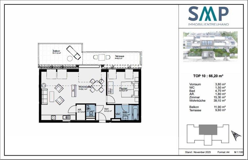 - Eckdaten: 2 Zimmer, 66,3 m² WFL, Balkon & Terrasse. Der Wohnung ist ein 3,49 m² großes Kellerabteil zugeordnet.