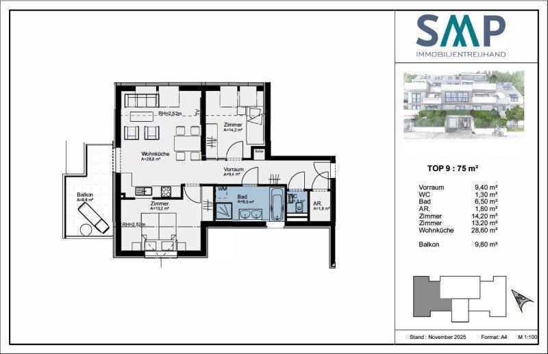 Eckdaten: 3 Zimmer, 75 m² WFL, 9,8 m² Balkon. Der Wohnung ist ein 1,47 m² großes Kellerabteil zugeordnet.