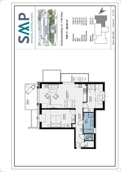 - Eckdaten: 3 Zimmer, 85,2 m² WFL, Balkon & Terrasse. Der Wohnung ist ein 3,49 m² großes Kellerabteil zugeordnet.