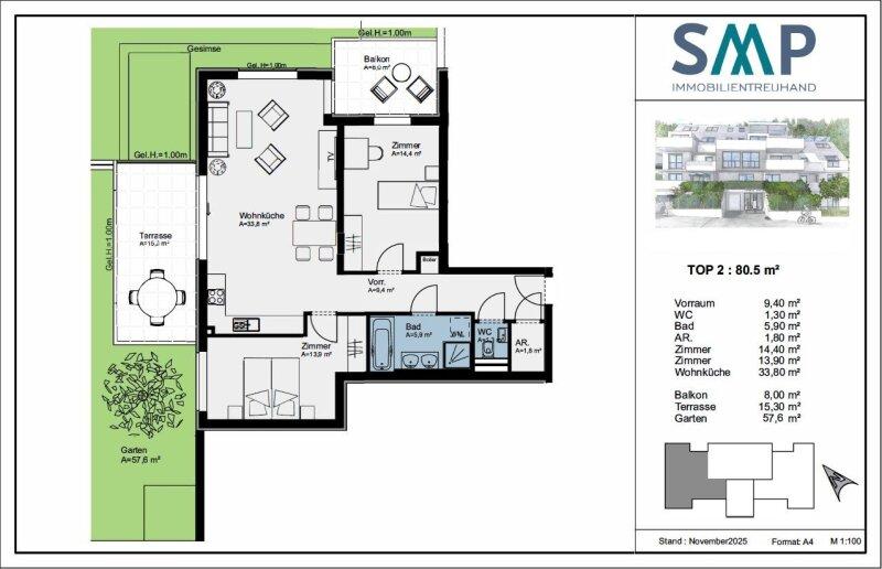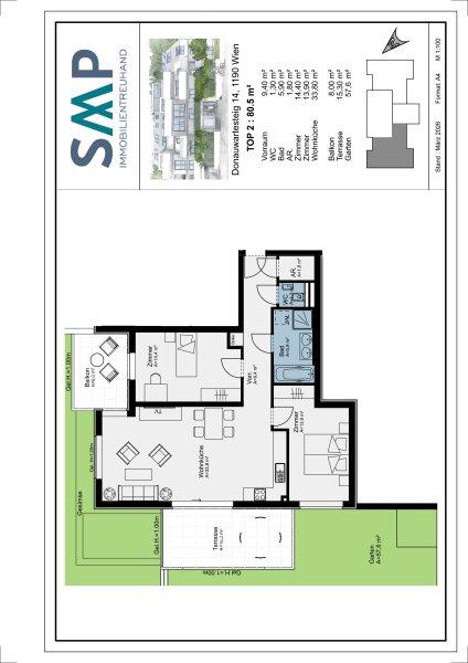 - Eckdaten: 3 Zimmer, 80,5 m² WFL, 57,6 m² Garten, Terrasse & Balkon. Der Wohnung ist ein 1,47 m² großes Kellerabteil zugeordnet.