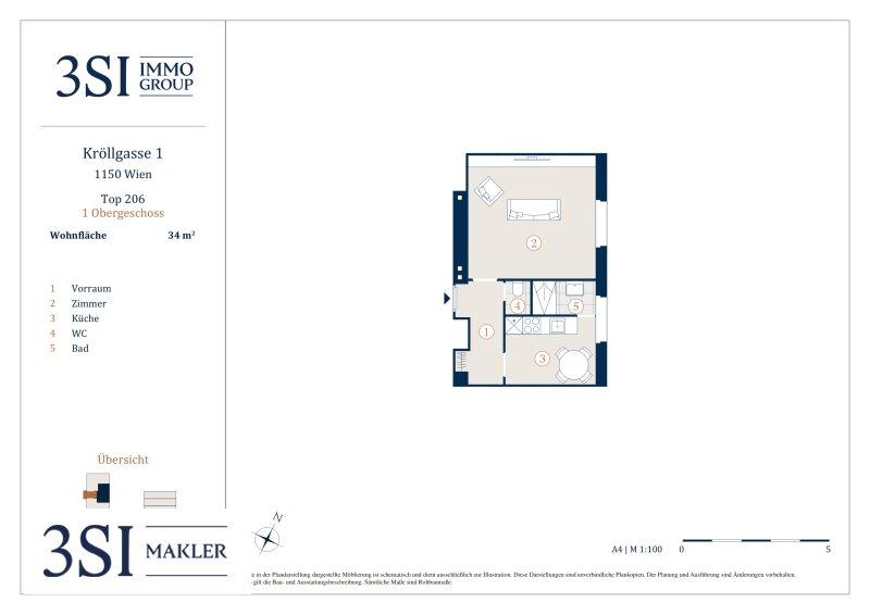 Die Wohnfläche von rund 34 m² überzeugt durch einen effizienten und gut durchdachten Grundriss, der sowohl Funktionalität als auch Wohnkomfort bietet. Die Raumaufteilung gestaltet sich wie folgt: