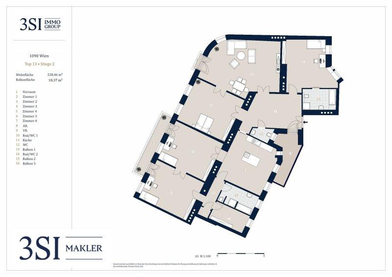 Zum Verkauf steht eine großzügige 6-Zimmer-Wohnung mit rund 228m² Wohnfläche und drei charmanten Balkonen in gebrauchten Zustand.
