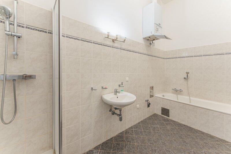 - Badezimmer mit Wanne, Dusche, Waschbecken und Waschmaschinenanschluss