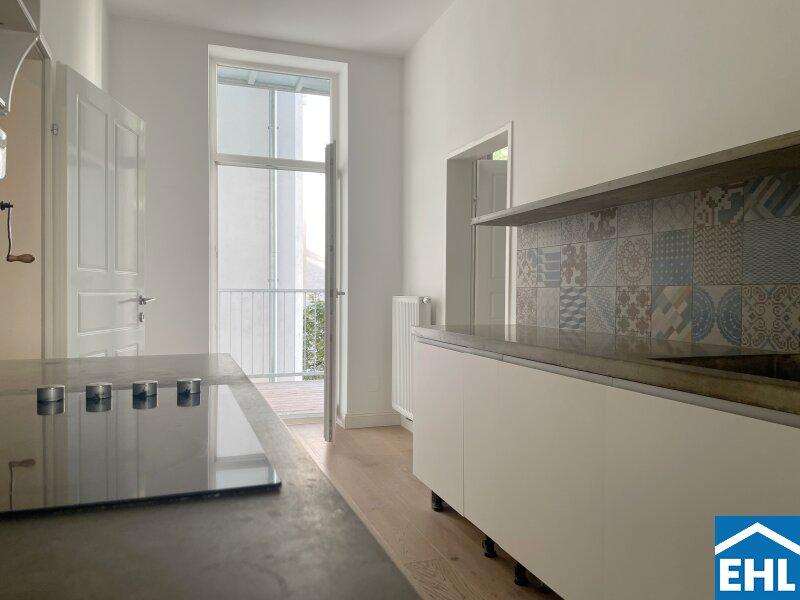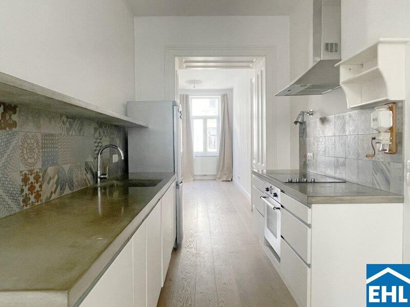 Im Mittelpunkt der Wohnung steht eine individuell gestaltete Küche, die nicht nur funktionaler Raum, sondern zugleich kommunikatives Zentrum ist. Von hier aus öffnen sich die Wege zum Balkon, zum großzügigen Wohnzimmer, zu einem der Schlafzimmer sowie zum Vorraum. Ein fließender Grundriss, der Offenheit und Struktur in harmonischem Gleichgewicht hält.